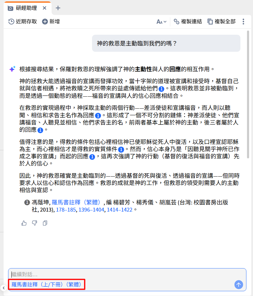 您現在可以進一步精確搜索:確切選擇您希望研經助理(Study Assistant)搜索的某一本書或某一套書。例如,在馮蔭坤的《羅馬書註釋》中搜索,神的救恩是主動臨到我們的嗎?