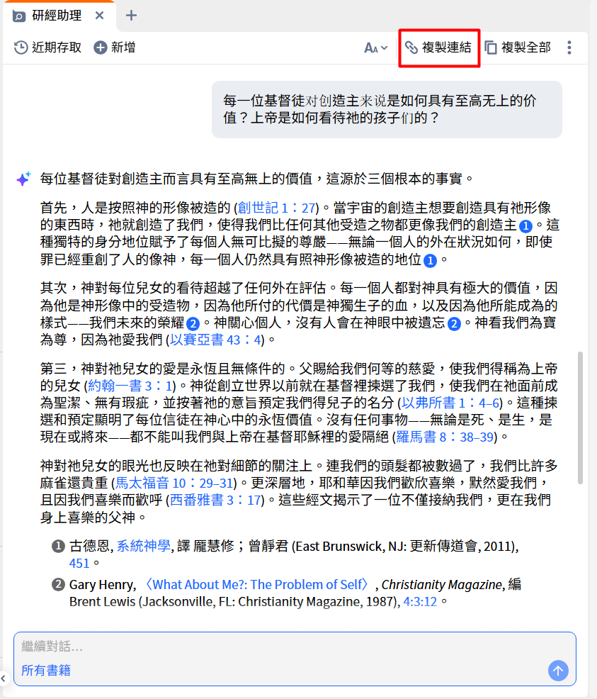透過點擊“複製鏈接”按鈕,您可以創建一個安全的鏈接,作爲該時刻對話的靜態快照。當您的朋友打開鏈接時,他們將看到與該時刻完全相同的對話內容。他們不需要是 Logos 用戶,也不需要下載Logos應用。